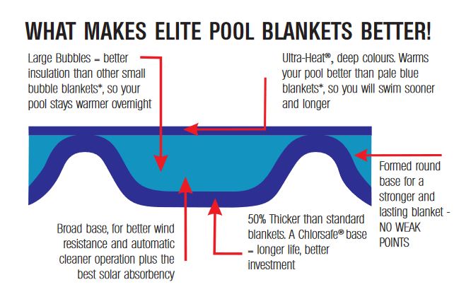 The Elite Solar Blanket comes in two models. The Elite Super Bubbleä Ultra Heat Pool Blanket and the Elite Super Bubble Solar Blanket. It was designed in Australia to withstand their harsh sun conditions, so is the perfect product to cope with New Zealand’s similarly strong sun.