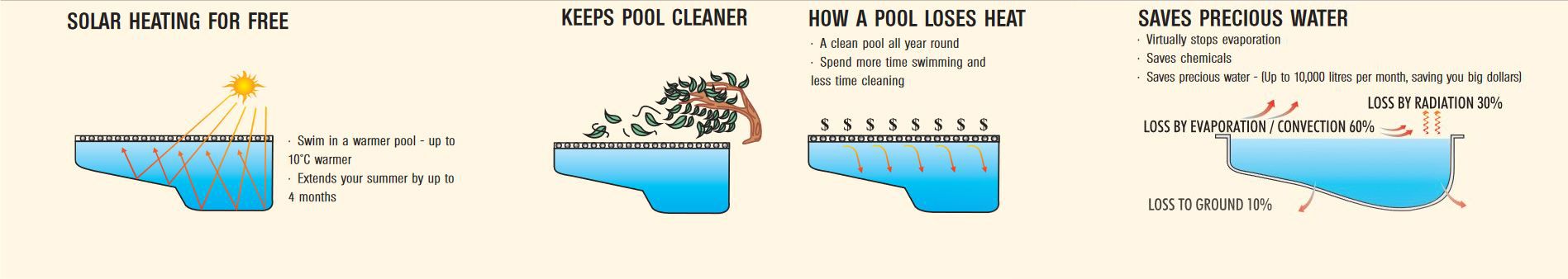- Significantly reduces heat loss from heated pools by up to 75%